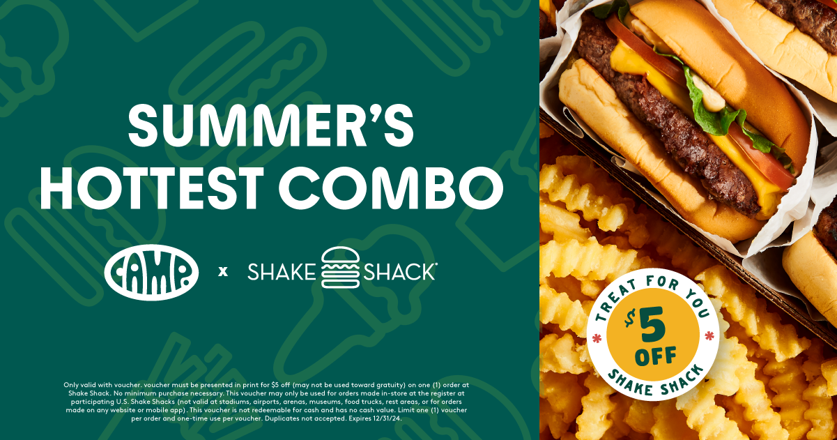 CAMP and Shake Shack have partnered up to bring you a tasty treat! Get a $5 voucher* to use on your next Shake Shack purchase when you join us for a fun-filled CAMP experience.